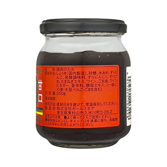 【原材料】しょうゆ(国内製造)、砂糖、水あめ、すりりんご、発酵調味料、すりにんにく、すりごま、たまねぎエキス、ワイン、ごま油、ワインビネガー、香辛料、酵母エキス、(一部に小麦・大豆・りんご・ごまを含む)
